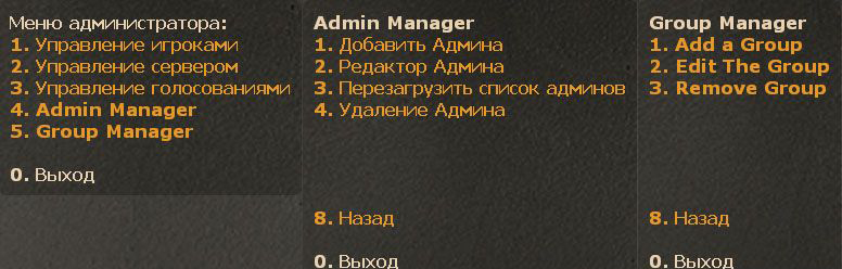 Управление, добавление админов и групп через меню! Дополнительные квары: sm_adminmanager Открывает главное меню. sm_editadmin Oткрывает меню редактирование админов. sm_removeadmin Oткрывает меню удаление админов. sm_reloadadmins Перезагружает кэш администратора. Для использования плагина, требуется флаг уровня Root[z] Распаковать в папку сервера P.S. Плагин работает как на 34 версии, так и на новой версии CSS | |