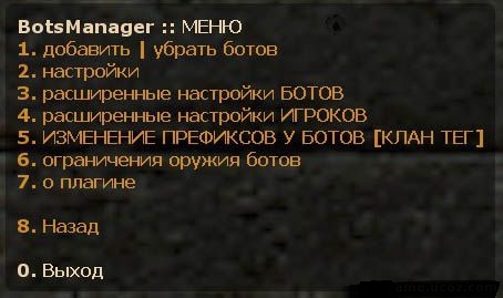Описание: Удобный плагин для управления ботами. Полностью на русском языке( + Английский) ----- Можно изменять количество хп, брони, и разрешать/запрещать шлем (как ботам так и людям) ----- Устанавливать Префиксы(Клан-теги) ботам отдельно команде контров и комманде террористов(По дефолту префикс устанавливаются сразу всем ботам)! тоесть можно добавить например 5 ботов за комманду (КТ) и 5 за комманду (Т) и установить им разные префиксы, для имитации Клан вара с ботами :)) ----- Устанавливать один из четырёх видов модели для всех ботов комманды! например можно всем ботом из комманды КТ установить одну модель(URBAN,GSG,SAS или GIGN) соответственно Террористам (PHOENIX,LEET,ARCTIC или GUERILLA) ----- Можно включать/выключать автоматическое убийство ботов, если живых игроков не осталось, также настраивать задержку в секундах перед тем как убить ботов(когда убивают последнего игрока), и убивать ботов или нет если установлена бомба(тоесть если егроков не осталось, но бомба установленна то можно им разрешить ёё разминировать, а можно это не учитывать и все равно убить их) ----- Маскировка BOT под пинг, как у игроков. и т.д ----- Меню можно вызвать из админ меню >> управление сервером >> БОТЫ в консоле коммандой bm ----- ЕСЛИ cfg файла нет он автоматически сгенерируется по пути .../cfg/sourcemod/BotsManager.cfg В нем легко разобраться, и настроить всё как надо. ------ все префиксы переменных изменены с bpl_ на bm_ ------ Исправленны ошибки, и особенно те которые выводят в консоль мусор об ошибках в файле перевода! ------ ещё добавлены 2 пункта в меню добавить|убрать изменить имена у кт ботов изменить имена у т ботов суть в том что при нажатии на эти пункты будут кикнуты боты например комманды КТ или Т и заново добавленно столько же ботов но уже с другими никами тупо но работает ------ Требования: Metamod, SourceMod | |