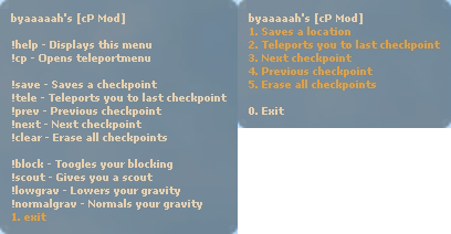 Описание: Команды: !clear - стереть все сохраненные чекпоинты !cp - открыть меню телепортации !save - сохранить чекпоинт !tele - телепортировать себя к последнему сохраненному чекпоинту !prev - предыдущий чекпоинт !next - следующий чекпоинт !wr - показать рекорд текущей карты !block - переключение режима блокировки !scout - взять оружие scout !lowgrav - установить низкую гравитацию игроку !normalgrav - установить значение гравитации по умолчанию !help - показать меню помощи Настройки(Cvars): sm_cp_enabled - <1|0> включение/отключение плагина. sm_cp_timer - <1|0> включение/отключение основного таймера карты. sm_cp_restore - <1|0> включение/отключение автоматического сохранения чекпоинтов в базу данных. sm_cp_cplimit - <0|10> установить лимит cp для каждого игрока. sm_cp_noblock - <1|0> включение/отключение блокировки игроков. sm_cp_alpha - <1|0> включение/отключение прозрачности игрока. sm_cp_autoflash - <1|0> включение/отключение флеш гранат. sm_cp_tracer - <1|0> Enable/Disable admin tracer. sm_cp_scoutlimit - <0|10> устанавливает предел scout для каждого игрока. sm_cp_gravity - <1|0> включение/отключение гравитации игрока. sm_cp_healclient - <1|0> включение/отключение исцеления при повреждениях. Админские команды: !cpadmin - показать админское меню sm_cp_resetcp - сбросить сохраненные чекпоинты всех игроков sm_cp_purgecp - очистка чекпоинтов sm_cp_resettimer - сбросить таймеры всех игроков | |