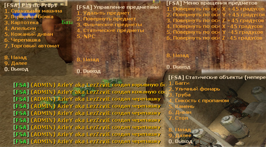 Настройки: fsa_rocket_will_kill По умолчанию 0 Умрет ли игрок от взрыва ракеты ( 0 - нет, 1 - да) fsa_rocket_speed По умолчанию 20 Скорость у ракеты (не ставить ниже 5) Флаг для админа "o" Использование: В консоль команда fsa, в чат !fsa или /fsa, чтобы забиндить bind кнопка fsa Другие команды: Команда "Jetpack" в чате: !jet Команда "GodMode" в чате: !godmode Команда того чтобы похоронить игрока, в чате: !bury Команда "unbury" в чате: !unbury Команда "разоружить" в чате: !disarm Команда "невидимости" в чате: !invis Команда "noclip" в чате: !clip Команда "регенерации" в чате: !regen Команда "возрождения" в чате: !respawn or !revive Команда "ракеты" в чате: !rocket Команда "скорости" в чате: !speed | |