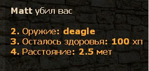 Настройки: kid_printtochat - показывать информацию об убийце жертвам в чате По умолчанию: 1 kid_printtopanel - показывать информацию об убийце жертвам в боковой панели По умолчанию: 0 kid_showdistance - показывать расстояние до убийцы По умолчанию: 1 kid_metricdistance - показывать дистанцию в метрах или футах По умолчанию: 1 kid_showarmorleft - показывать сколько брони осталось По умолчанию: 1 kid_announce_on_timer [new] - сообщать ли в чате о возможности включения\выключения (!settings) По умолчанию: 1 kid_pref_default [new] - включить или выключить по умолчанию информационную панель. По умолчанию: 1 Клиентские чат команды: !kid или /kid для включения/отключения работы плагина !settings редактирование настроек Конфигурационный файл: cfg/sourcemod/plugin.killer_info_display.cfg (автоматически создастся после первого запуска) Не забудьте обновить настройки вручную если обновляете плагин! | |