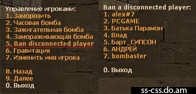Версия: 1.0.0a Описание: Плагин сохраняет имена игроков и их steam id, которые вышли из сервера, позволяя администратору их забанить потом через меню. Для бана плагин использует команду "sm_addban", поэтому он работает с плагинами basebans и sourcebans. Установка: Распаковать в папку сервера. Серверные комады: sm_tltb Показать меню с отключившимися игроками (команда !tltb или /tltb в чате) sm_tltb reset Сбросить список отключившихся игроков sm_tltb resetmenu Сбросить файл с бан опциями меню Серверные настройки: tltb_check_reason 0/1 (по умолчанию 0) Сохранять информацию об игроках, которые отключились сами tltb_stored_players 0-20 (по умолчанию 7) Максимальное количество игроков для сохранения tltb_players_order 0/1 (по умолчанию 1) Показывать последнего отключившиегося игрока первым по спику в меню tltb_use_ban_reason 0/1 (по умолчанию 1) Показывать меню с причиной бана tltb_use_admin_menu 0/1 (по умолчанию 1) Добавить опцию "Ban disconnected player" в главное админское меню Описание: | |