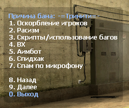Русифицированное меню "Забанить игрока" (Полностью на русском языке) Всем известно, что даже если выставить язык SourceMod RU, то некоторые фишки всё равно остаются английскими, включая "Причины бана". В архиве уже содержаться переведённые фразы. Установка: 1.Содержимое архива извлечь в папку cstrike c Заменой Файлов (Обязательно!) 2.Перезапустить сервер | |